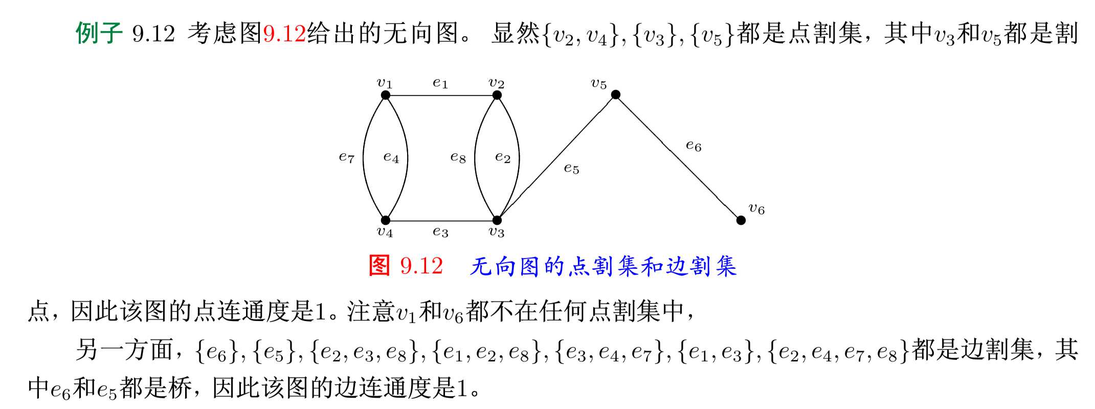- 点割集:一组顶点的集合,若将这些顶点(少一个都不行)及其关联的边移除后,图会被分割成多个连通分量(或不再连通)。