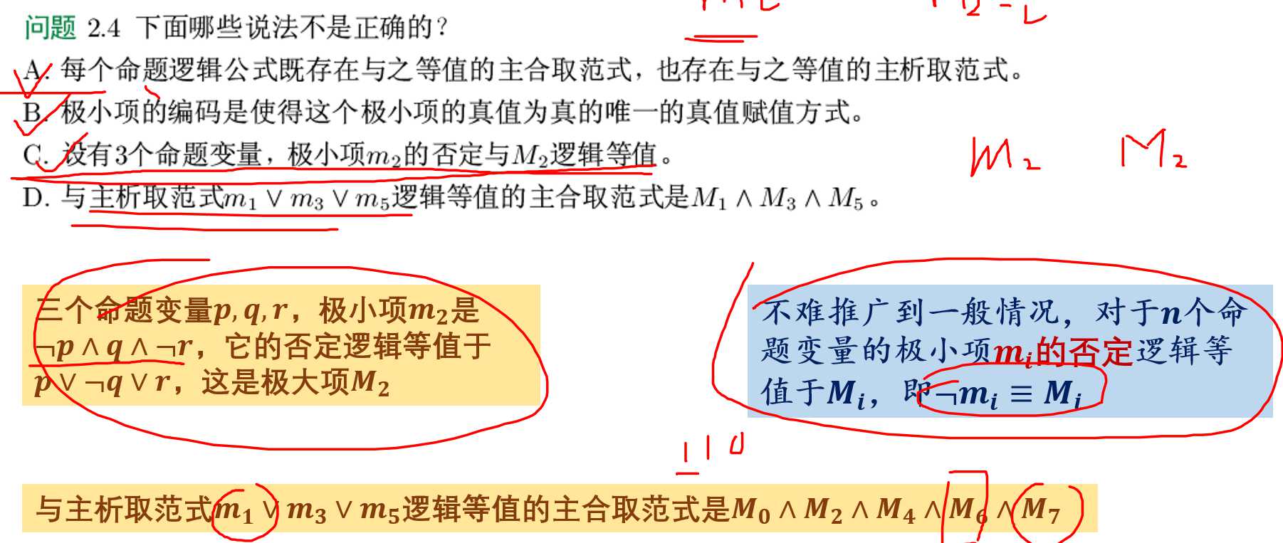 - 先求出主析取范式,遇到不是的,拓展(与一个1,然后用排中律,再用分配律)