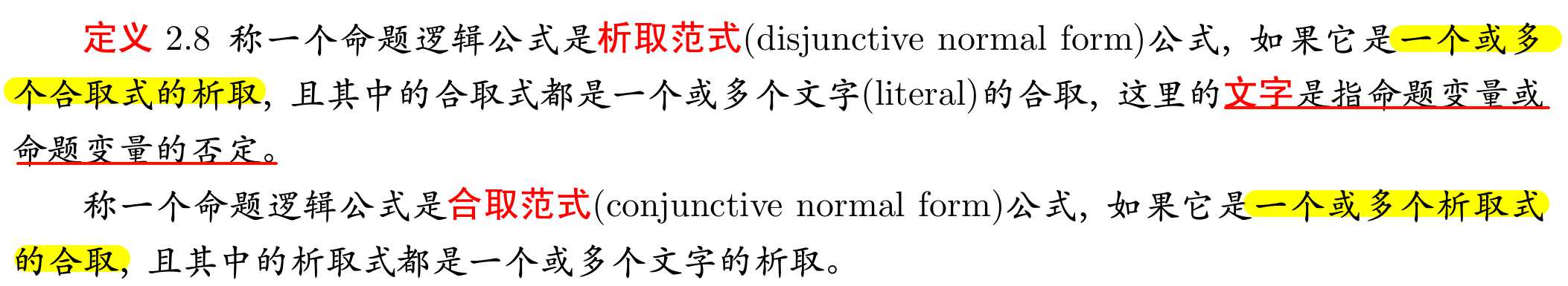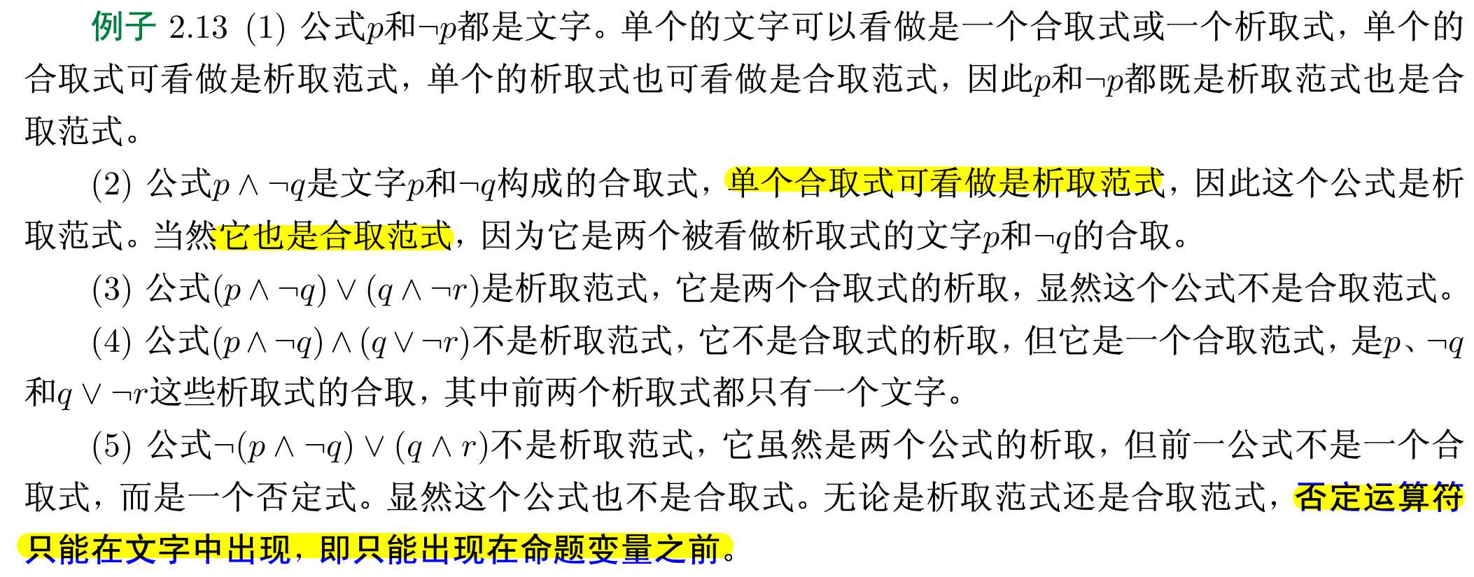 - ==单个的文字可以看做是一个合取式或一个析取式,单个的合取式可看做是析取范式,单个的析取式也可看做是合取范式==